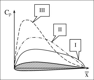 Изменение картины распределения давления (разрежения) по зонам стреловидного крыла. III – концевая зона, I – корневая зона, II – средняя зона.