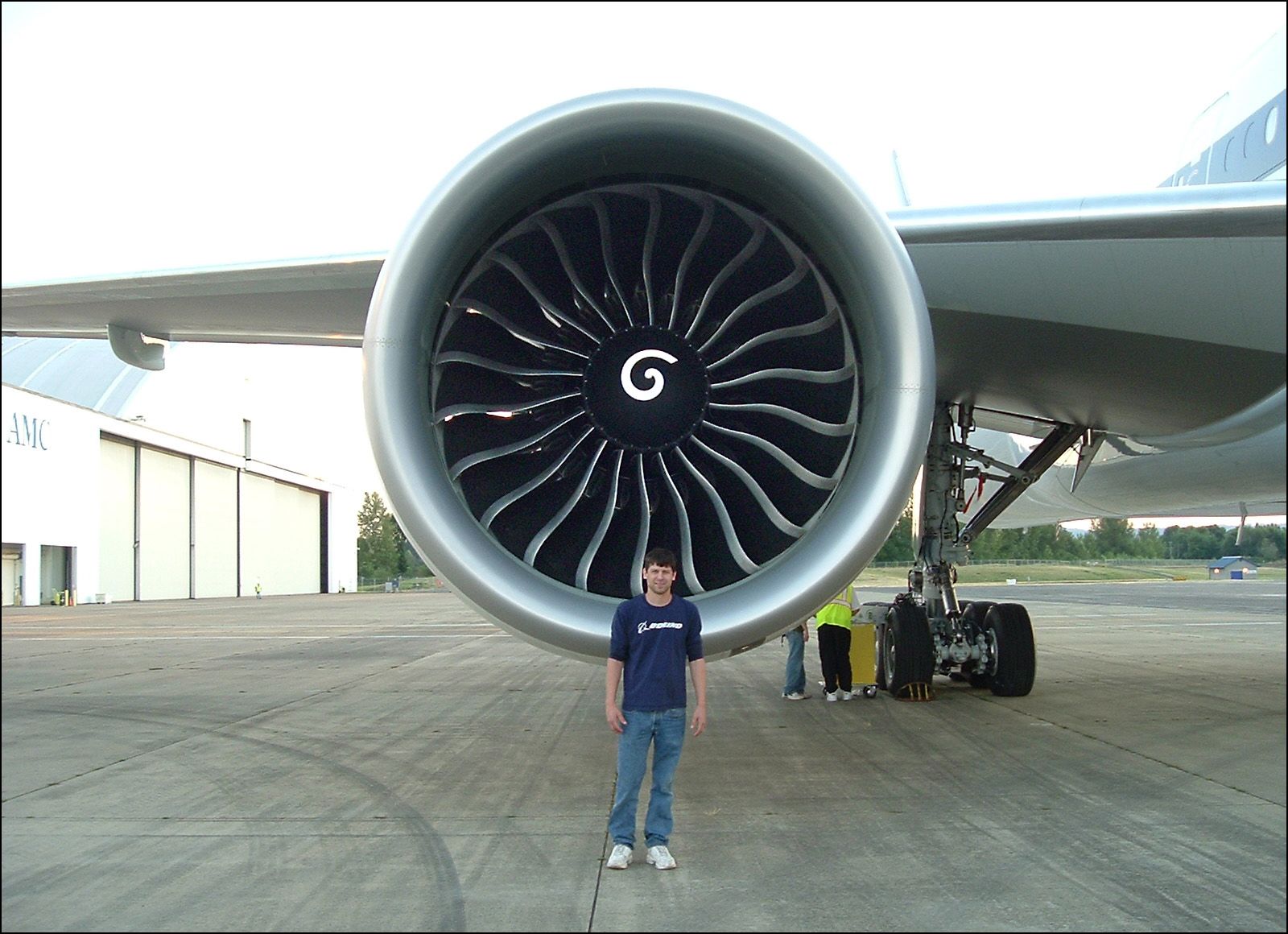Двигатель GE90 на самолете Boeing 777-300ER. Обратите внимание на размеры и форму лопаток вентилятора.